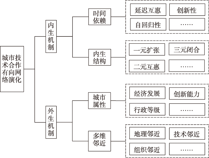 城市属性和城市间的多维邻近性仅从一元属性和二元关系变量角度考虑了城市间技术合作的生成机制,社会网络建构的初衷更强调从多元关系的视角窥探网络发育的机制,城市间技术合作不仅受到自身和合作城市属性的影响,还受到网络结构和多元关系的自组织作用。近年来,创新地理学者利用ERGM、SAOM等模型[29⇓-31]对城市创新网络进行研究,揭示了网络自组织结构对网络演化的推动作用。通常认为,城市创新网络节点存在显著的互惠性、聚敛性和扩散性特征,即城市节点倾向于产生双向的技术联系,并呈现显著的择优链接趋势,但鲜有论及上述结构在技术合作网络中的动态演化特征。部分学者通过对城市创新网络中的三方关系进行研究[28,32],发现了创新网络具有三元闭合特性,即拥有相同连接城市的两城市倾向于在中介作用下发生关系闭合,但对三元闭合模式缺乏系统论述与实证。上述结构动力分别可以归纳为一元节点的关系扩张性、二元节点的互惠性、三元节点的关系传递性。动态指数随机图模型(TERGM)的出现将网络演化的内生结构和时间依赖相结合,认为前期节点联系是后期节点联系的影响因素,在技术合作网络中,前期合作关系的建立对后期合作关系的延续和扩展具有基础性作用,可通过引入延迟互惠性、自回归性、创新性等时间趋势项观察节点联系的前后变化。综上,微观结构的自组织是驱动网络演化和塑造网络特征的重要动力因素,网络的内生自组织机制,伴随外生的节点属性和邻近性因素,共同作用于技术合作网络的演化(图1)。