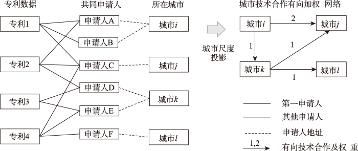 城市技术合作有向网络本质上是多技术申请人关系体系与城市网络的集合,其存在的基础包括:① 在行为维度上,技术合作是多技术申请人之间的交互行为,第一申请人作为技术开发过程的引领者,通过召集、组织、交流、分享、引进等方式,与其他申请人产生交互行为,其过程隐含关系强度、社会资本和相互信任等机制[19],交互行为决定了主体合作关系空间投影的城市技术合作有向关系必然存在。② 在主体维度上,城市技术合作有向网络的主体是企业、高校、科研院所等,形成全球地方跨尺度的地方技术联盟与国际技术协会[20,21],主体本身具有“关系集合”的属性,既包括单一组织中的申请人与申请人之间关系,也包括组织与组织之间、城市与城市之间的关系。技术主体体系的强者-弱者关系,不仅强化了城市技术锁定效应,而且推动了城市技术网络位势的重构[15]。③ 在客体维度上,城市技术合作有向网络的客体是基于技术标准和规范而构成的技术生态[22,23],在城市网络中,技术生态体系本身具有强大的“黏性”,技术生态在技术合作网络链接中扩散,进而在城市技术合作有向网络中产生了“网络凝聚”赢者通吃现象。