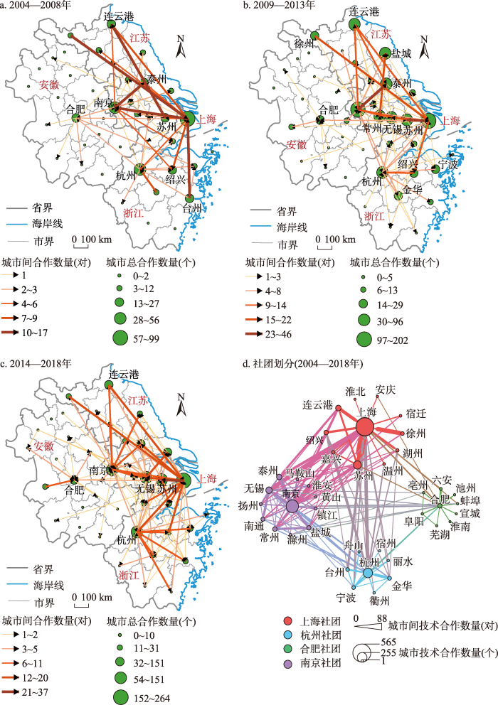 从时间演变特征来看,网络结构呈现较强的稳定性和延续性。通过2004—2008年、2009—2013年、2014—2018年三个时间段的比较发现,分别有60.94%、70.41%的联系被延续到后期,且丢失联系多为关系较弱的节点对,网络的主干结构基本保持不变。这一特征表明了前期城市合作关系建立而形成的城际技术合作通道,对后期联系的生成和扩张具有基础性作用。